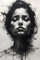 Een bezwerend expressieve tekening met inkt en steenkool, alsof de emoties zelf op de pagina zijn vastgelegd in een vluchtig, maar eeuwig, moment van kwetsbaarheid, waarbij elke lijn, vlek en kras een verhaal vertelt over pijn, verlangen of triomf.