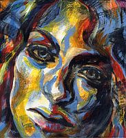 Close up portret van een gezicht van een vrouw in vele kleuren en lagen geschilderd.
