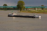 Een binnenvaartschip in het rivieren landschap