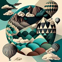 Deze betoverende bolvormige illustratie verbeeldt een dromerig landschap waar bergen, pluizige wolken en heteluchtballonnen in perfecte harmonie samenleven. De compositie heeft een grillige stijl en wordt aangevuld met geometrische patronen en een rustgevend, gedempt kleurenpalet van turquoise, bruin en crème. De cirkelvormige lay-out…