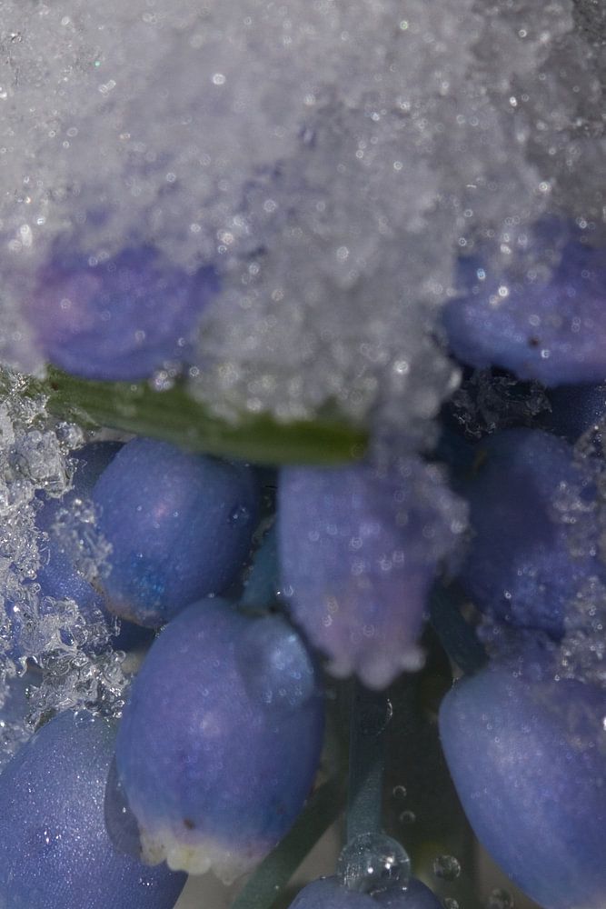 In de nacht was er sneeuw gevallen maar die ging heel snel smelten. Dit blauwe druifje bloeit al weken in de tuin en stond er nu ineens bij met een sneeuwhoed van smeltende sneeuw.