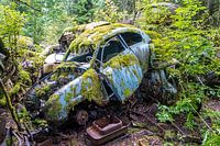 Als het decor van een post acopalyptische zombiefilm. Bastnas Auto kerkhof in Zweden. In de bosrijke omgeving van het gehucht Bastnas , ongeveer twintig kilometer onder het plaatsje Tocksfors, op de grens tussen Zweden en Noorwegen ligt een verlaten autokerkhof. Het resultaat van een auto onderdelen handel van twee Zweedse broers die voornamelijk zaken deden met Noorse klanten. Het omvangrijke terrein bevat enkele huizen en bijgebouwen, en is vrij toegankelijk als je je aan de regels houdt. Je mag de gebouwen niet binnentreden, en niets van het terrein meenemen. Nadat de twee broers gestopt zijn met hun bedrijf, neemt de natuur het terrein weer over. Een oude blauwe Saab 96 overwoekerd met mos.. Deze foto is gemaakt met een Fujifilm X-T3 gemonteerd op een statief tijdens een regenachtige Zomerdag in 2022
