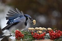 Een blauwe gaai bij de tuinvoeder van Claude Laprise