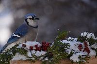 Een blauwe gaai bij de tuinvoeder van Claude Laprise