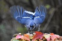 Een blauwe gaai bij de tuinvoeder van Claude Laprise