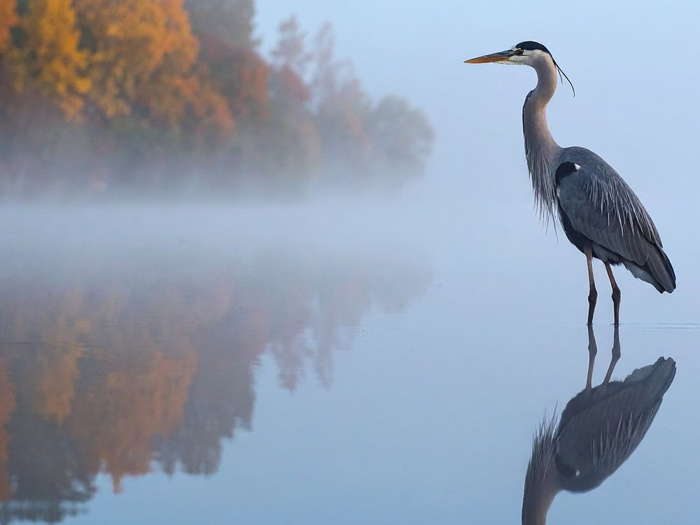 Betoverende ochtendstemming bij het meer met herfstachtige sfeer. Een blauwe reiger staat sierlijk in het ondiepe water en wordt erin weerspiegeld. De kleurrijke herfstbomen, die ook weerspiegeld worden in het water, vormen een prachtig contrast met de koele blauwe tinten. Een heerlijk rustig moment, delicate nevelsluiers drijven over het wateroppervlak en geven de foto een magische sfeer.