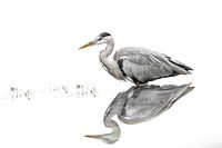 Blauwe reiger in het water en een bijna kunstmatige weerspiegeling in het water.