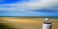 Een meeuw kijkt over het strand en de zee, in panoramisch formaat.