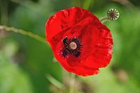 Een bloeiende klaproos met zijn uitgebloeide broertje ernaast.