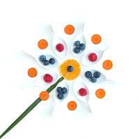 Op de witte schaaltjes ligt blauwe bessen, framboos.