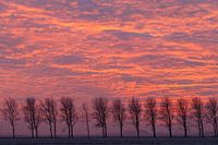 Een echte Nederlandse polder met een rij bomen. De zonsondergang zorgt voor een mooi tafereel in de winter. Prachtige lucht met een oranje gloed.