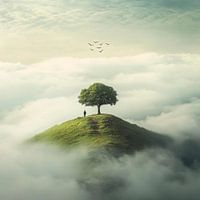 De afbeelding toont een eenzame figuur op een glooiende heuvel, omgeven door dichte, zacht glinsterende wolken. Een prachtige boom met weelderige, groene bladeren torent majestueus boven het landschap uit. Vogels vliegen in formatie over, waardoor het beeld een vredige, bijna dromerige sfeer krijgt en de kijker wordt aangemoedigd om te dagdromen.