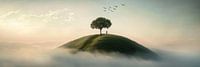 De foto toont een eenzame boom op een glooiende heuvel, omgeven door een mystieke mist. Erboven vliegen vogels naar de vrijheid, terwijl de lucht zachte kleurovergangen vertoont. Dit landschap straalt rust en eenzaamheid uit en nodigt de kijker uit om zich onder te dompelen in een dromerige wereld.