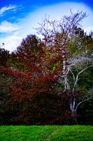 Zij aan zij stonden ze daar in het gras. Een boom met en een boom zonder bladeren. Door het wit van de kale boom leken de bladeren aan de andere boom nog dieper van kleur. Rood bruin in stijl bij het seizoen, de herfst.