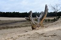 Deze foto heb ik gemaakt op de Beekhuizerzand bij Harderwijk, het is zelfs een oefenterrein van defensie. De stronk wat je ziet is van een grove den wat wel meer groeit op de Veluwe, het staat in de buurt van een uitzichtpunt met zicht over de zandverstuiving. Om deze foto te kunnen maken heb ik mijn camera op statief gezet en heb ook 2 reportageflitsers gebruikt om deze stronk uit te lichten, de statief waar mijn camera op stond stond wel op de laagste stand wat de statief aan kon om zo dicht bij de grond te komen met de camera. Ondanks dat ik 2 reportage flitsers heb gebruikt is de sluitertijd redelijk lang. Toen ik deze foto maakte was het nog winter, zoals je kunt zien was het ook bewolkt. Er stond zelfs redelijk wat wind toen ik deze foto maakte. Om op deze plek te kunnen komen heb ik mijn fiets gepakt ook al is het een stukje fietsen.