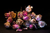 Een bos gedroogde of verwelkte rozen . Witte, rode en roze kleuren tegen een zwarte achtergrond met een uitgekiende belichting gefotografeerd.