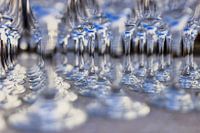 Hangende glazen, gefotografeerd in een horecagelegenheid.