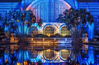 Dit is het iconische Botanical Building dat reflecteert op de Lily Pond in Balboa Park. San Diego, Californië, Verenigde Staten.