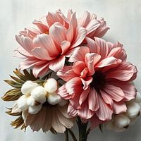 een zacht bouquet bloemen van meerdere poeder pastel kleuren van roze en wit pioenrozen op een geschilderde beige wit achtergrond.