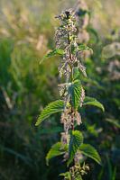 Een brandnetel met groene bladeren en bloemen staat in de weide tegen het licht.