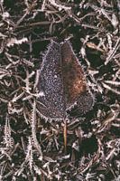 Een bruin blad met vorst in de winter met rijp. Schitterende details van het vergaande blad in de natuur. De stevige kou zorgt voor rijp en prachtige details in de foto. Dit is de macrofotografie variant, er is ook een foto warin er meer natuur te zien is.