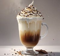 een stilleven foto van een heerlijk warme caffé latte in groot glas met koffie en gevuld met slagroom en topping chocolade schaafsel sprinkels erboven op gestrooid staand op een wit beige licht grijze achtergrond.