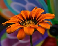 Deze kleurrijke oranje bloem met strepen close up op een divers gekleurde achtergrond maakte ik in mijn achtertuin.