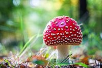 Een typisch herfstbeeld. Een jonge vliegenzwam op een zonnige herfstdag in het bos van Landgoed Amelisweerd, Provincie Utrecht, Nederland