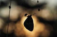 Een dambordje hangend aan de vegetatie van de Viroinval, Ardennen België. Op de achtergrond de zonsopkomst.