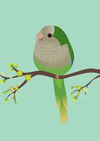Een tekening in vectoren van een muisparkiet, ook wel monniksparkiet genoemd. De vogel heeft de vorm van een eitje en ziet er erg schattig uit. Hij zit op een takje met gele bloemetjes en zit lekker relaxed op een pootje, wat vogels doen als ze op hun gemak zijn.