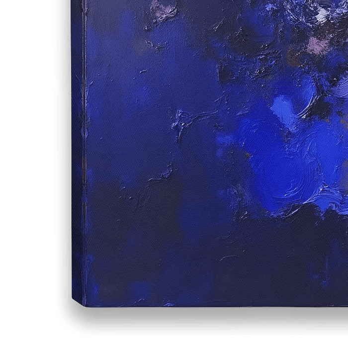 Dit abstracte werk maakt gebruik van een levendig palet van diepblauw, lichtgevend geel en een vleugje paars. De kleuren lopen naadloos in elkaar over en creëren een gevoel van beweging en energie. Cirkelvormige patronen en getextureerde penseelstreken voegen diepte toe, trekken de aandacht en nodigen uit tot verkennen. De donkere tinten aan de linkerkant contrasteren met de lichte, vrolijke tinten aan de rechterkant en symboliseren een overgang of overgang. Deze juxtapositie roept intense emoties op en suggereert een scène die zowel kosmisch als aards is. De vaardigheid van de kunstenaar in het manipuleren van licht en schaduw is opmerkelijk en transformeert vlakke kleurvlakken in een dynamisch en suggestief tafereel. De evenwichtige compositie en rijke textuur maken dit werk uniek en boeiend en bieden een meeslepende visuele en emotionele ervaring.