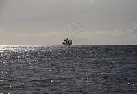 Een driemaster in het tegenlicht op de Caraïbische Zee, zeilend bij zonsondergang vlak bij het tropische eiland Saint Lucia.