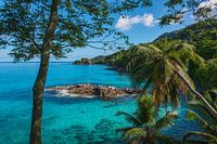 Een droomachtig tropisch strandlandschap bij Beau Vallon op het eiland Mahé nodigt je uit om te gaan snorkelen en zwemmen.