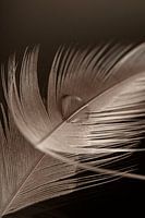"Een druppel liggend op een veertje " is een macrofoto van een rustig tafereeltje (stilleven): Een druppeltje liggend op een veer.