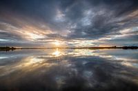 Tijdens deze prachtige zonsondergang was de zon niet veel te zien, vaak achter de bewolking. Maar zo nu en dan kneep hij er even tussendoor, en dan had je er zomaar twee te pakken. Het water was zo spiegelglad doordat het windstil was, en dus leverde dat dit mooie moment op.