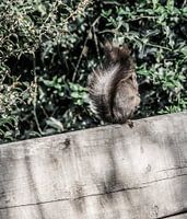 Een grijze eekhoorn genietend van zijn opgegraven walnoot.