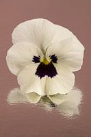 "Een eenvoudig viooltje" met Moccha Mousse kleur achtergrond, is een foto van een groot wit viooltje, wat staat op een ondergrond van een speciaal reflecterend materiaal met een structuur erin. Hierdoor wordt het spiegelbeeld gebroken in een abstracte weergave. Het lijkt net of het viooltje weerspiegelt in kabbelend water.
