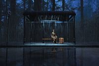 Een eenzaam afscheid is een verhalend werk waarin u een vrouw ziet zitten op een bankje in de bushalte. Naast haar staat een bruine koffer. Het is regenachtig weer, er vormen zich plassen op de weg en ook de verlichting van het bushokje oogt troosteloos. Aan het gebrek van daglicht te zien komt de zon net op of gaat hij net onder.