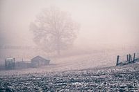 Een huisje onder een oude eik ergens op het platteland in Luxemburg , de mist geeft het iets mystiek .