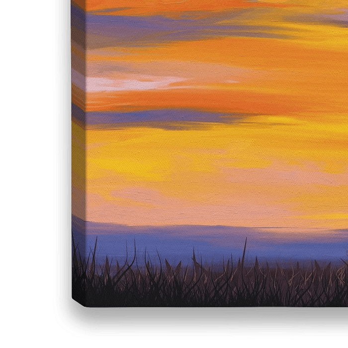 Digitaal acrylschilderij van een vlak landschap met een eenzame boom. De ondergaande zon tovert dramatische kleuren aan de hemel en laat enkele grassprieten hier en daar een beetje glimmen.