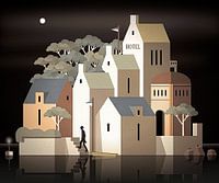 De lichtval veroorzaakt door het maanlicht heeft tegelijkertijd iets geheimzinnig en vredig. Hoe laten de afwisselende lichte en donkere kleurvlakken in het diepe water jou voelen? En wat van de door het maanlicht verlichte gebouwen en bomen? Zou je op dit eiland willen wonen?