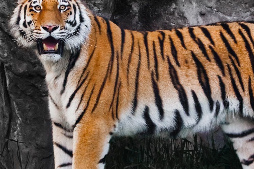 Een fel oranje gestreepte tijger steekt af tegen een verkleurde achtergrond, een prachtig beest