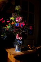 Bloemen met natuurlijk licht belicht, haalt de zon in huis. Van deze kleuren wordt je vrolijk. Een print in stijl van de oude meesters. Geweldig de schaduw in het boeket en op tafel.