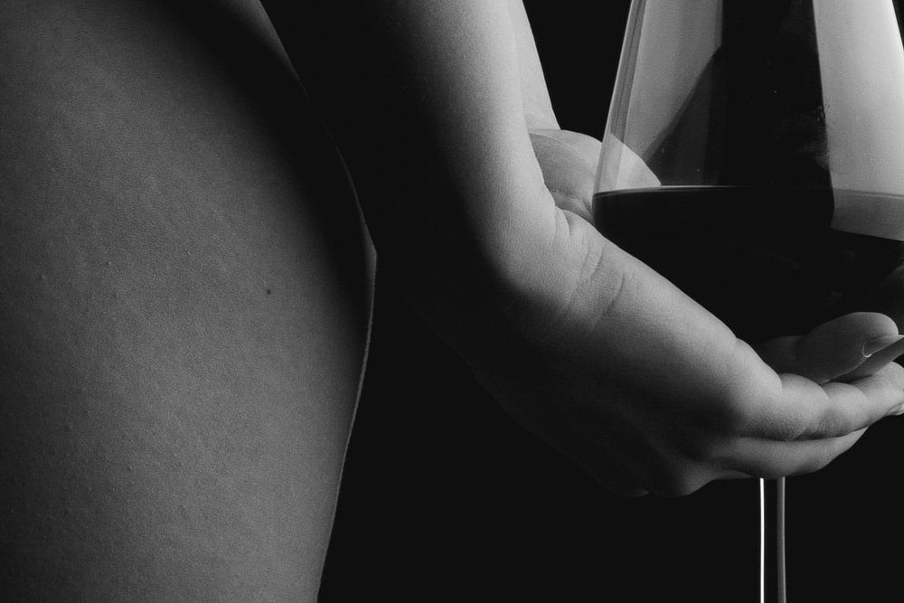 Deze stijlvolle zwart-witfoto toont een naakte vrouw die achter haar rug een glas rode wijn vasthoudt, een pose die tegelijk krachtig, sensueel en mysterieus oogt. Het contrast tussen de zachte, ronde lijnen van haar lichaam en de strakke geometrie van het wijnglas creëert een intrigerende visuele spanning die de blik vasthoudt. Het spel van licht en schaduw accentueert de vrouwelijke vormen op subtiele wijze, zonder iets expliciet prijs te geven, waardoor de foto een verfijnde balans vindt tussen sensualiteit en suggestie.
