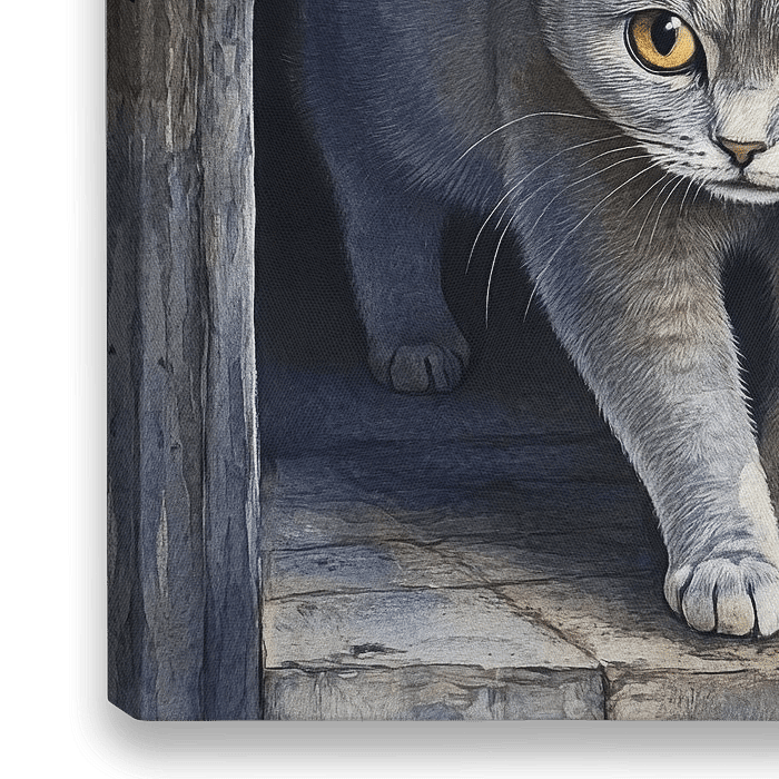 Een nieuwsgierige grijze kat met opvallende gele ogen stapt voorzichtig uit een houten deurkozijn. Het omringende hout vertoont duidelijke tekenen van ouderdom met roestvlekken en verwering.