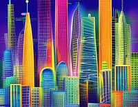 Een futuristisch kleurrijk stadsgezicht, geproduceerd met behulp van kunstmatige intelligentie (AI). Dit kunstwerk belichaamt de harmonieuze samensmelting van technologie en creativiteit, waarbij wordt gebruikt om een verbluffend visueel meesterwerk te creëren.