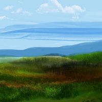 Landschapschilderij met glooiende beboste heuvels en een meer op de achtergrond. De sfeer is sereen en vredig en geeft een gevoel van stille schoonheid en rust in de natuur.