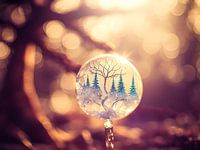 Een uitnodigende fantasiewereld waar de natuur in bijzondere doorschijnende vormen groeit. Deze glazen bol is gevuld met verschillende kleine boompjes. Het warme zonlicht verlicht het geheel.