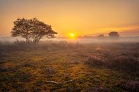 Zonsopkomst tijdens een mistige ochtend op de Westerheide bij Hilversum. De zon liet zich maar kort zien, maar zorgde voor een prachtig gouden gloed.