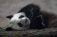 Een grappige panda ligt op zijn zij op een boomstam, schattige vredige beer